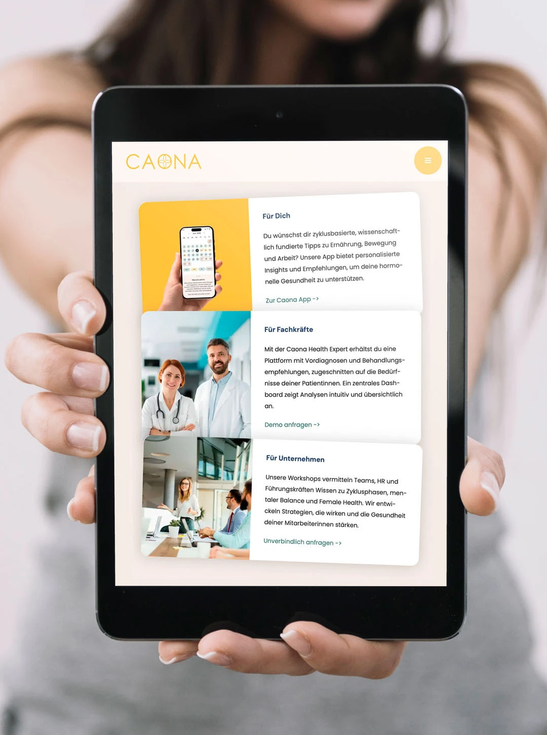 Caona Health steht für eine neue Generation von Frauengesundheit. Die App verbindet datenbasierte Technologie, wissenschaftliche Erkenntnisse und Empowerment zu einem ganzheitlichen Ansatz für hormonelle Gesundheit. Im Rahmen des Website-Relaunchs haben wir gemeinsam mit dem Caona-Team eine digitale Plattform geschaffen, die diese Vision widerspiegelt: modern, informativ und benutzerfreundlich. Die Umsetzung erfolgte in Webflow, vollständig responsive, mehrsprachig und performanceoptimiert. Dabei stand nicht nur das Design im Vordergrund, sondern auch die Barrierefreiheit und User Experience – klar strukturierte Inhalte, emotionale Bildsprache und ein intuitiver Aufbau leiten durch Themen wie App, Workshops und Community. Das Projekt liegt uns auch persönlich am Herzen: Female Health ist ein zentrales Zukunftsthema, das Sichtbarkeit verdient. Mit dem neuen Webauftritt erhält Caona die digitale Bühne, die ihre Mission stärkt – Frauen dabei zu unterstützen, ihre eigene Gesundheitsexpertin zu werden.