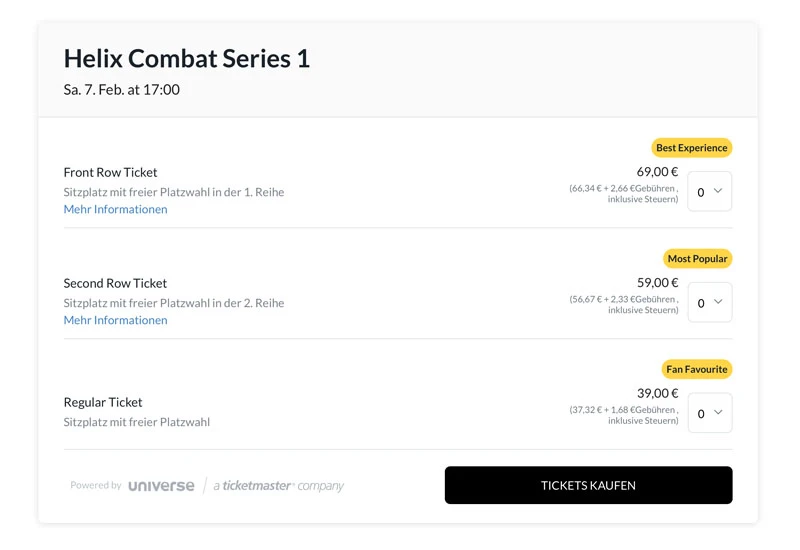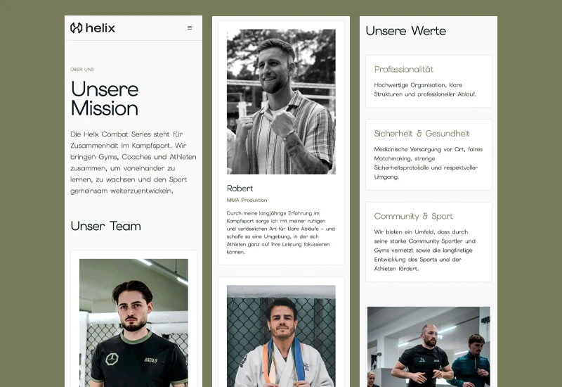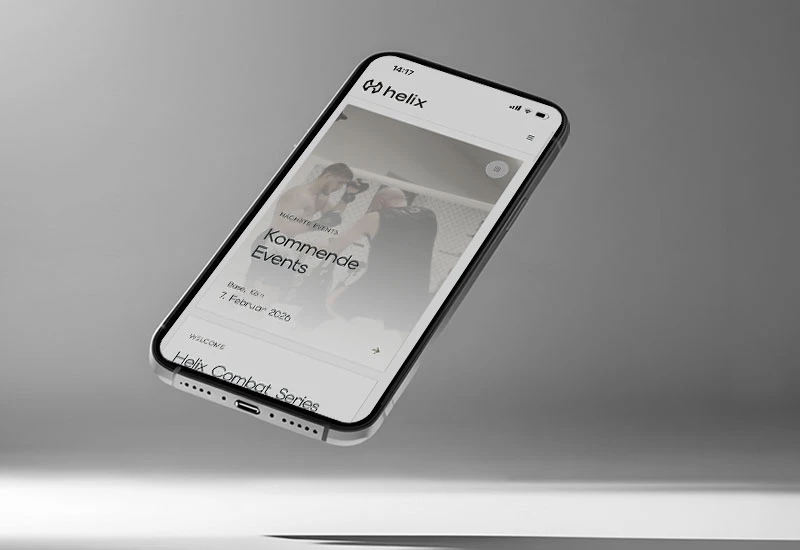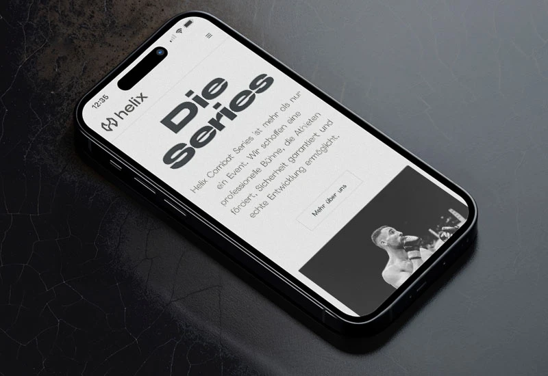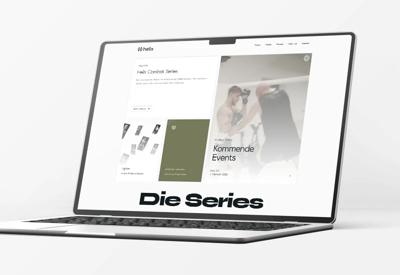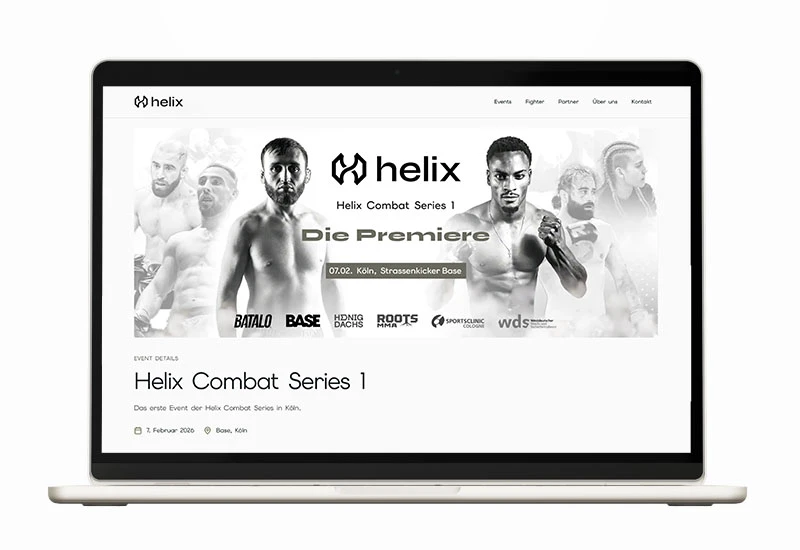 Für die Helix Combat Series haben wir das komplette Branding samt Logo, Bildsprache und Corporate Design entwickelt und eine moderne Web-Platform realisiert – inklusive Ticketing, Fighter-Infos, Partnerpräsentation und Video-Content. Ein cleaner, hochwertiger Auftritt, der sich bewusst vom typischen Kampfsportlook abhebt.