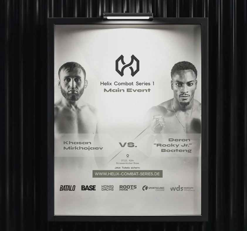 Für die Helix Combat Series aus Köln durften wir als offizieller Grafik- und Marketing-Partner das komplette Corporate Design entwickeln: Logo, Farbwelt, Typografie, Bildsprache und ein visueller Auftritt, der Kampfsport hochwertig, fair und zeitgemäß präsentiert. Weg von überladenen Fight-Visuals – hin zu einer klaren, präzisen Designsprache, die die Professionalität der Eventreihe sichtbar macht und sich deutlich vom Umfeld absetzt.