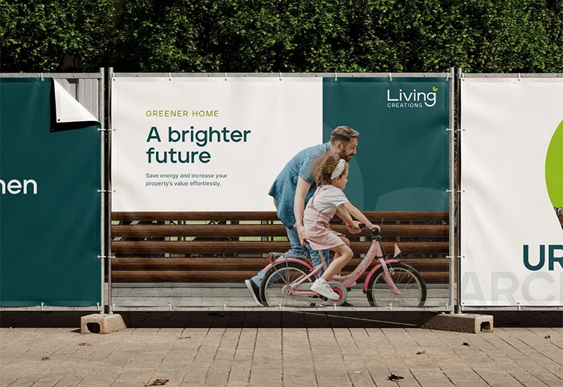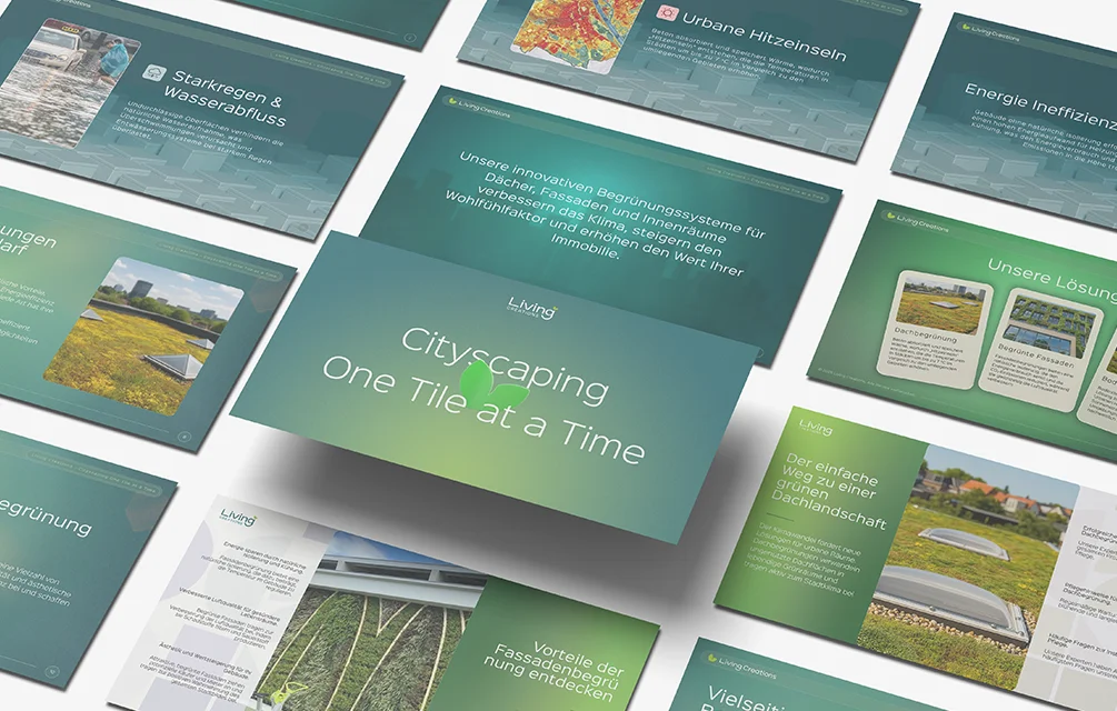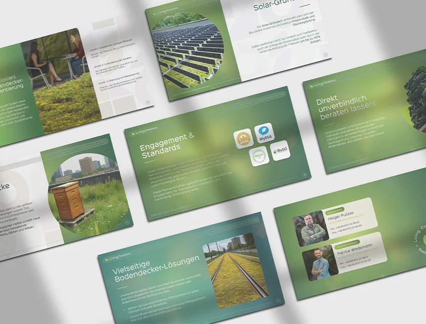 Für Living Creations GmbH haben wir einen ganzheitlichen Markenauftritt entwickelt, der Nachhaltigkeit, Qualität und Innovationskraft sichtbar macht. Vom Logo über ein konsistentes Corporate Design bis hin zu Brandbook, Geschäftsausstattung und Imagebroschüre entstand eine visuelle Identität, die den Anspruch des Unternehmens klar kommuniziert. Living Creations steht für hochwertige Begrünungslösungen – von Dach- und Fassadenbegrünungen bis hin zu begrünten Innenräumen. Ziel war es, diese Kompetenz modern, vertrauenswürdig und zeitgemäß darzustellen und eine Marke zu schaffen, die sowohl architektonisch als auch emotional überzeugt.